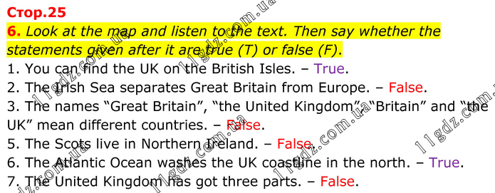 6. Look at the map and listen to the text. Then say whether the statements given after it are true (T) or false (F). 1. You can find the UK on the British Isles. – True. 2. The Irish Sea separates Great Britain from Europe. – False. 3. The names “Great Britain”, “the United Kingdom”, “Britain” and “the UK” mean different countries. – False. 5. The Scots live in Northern Ireland. – False. 6. The Atlantic Ocean washes the UK coastline in the north. – True. 7. The United Kingdom has got three parts. – False.
