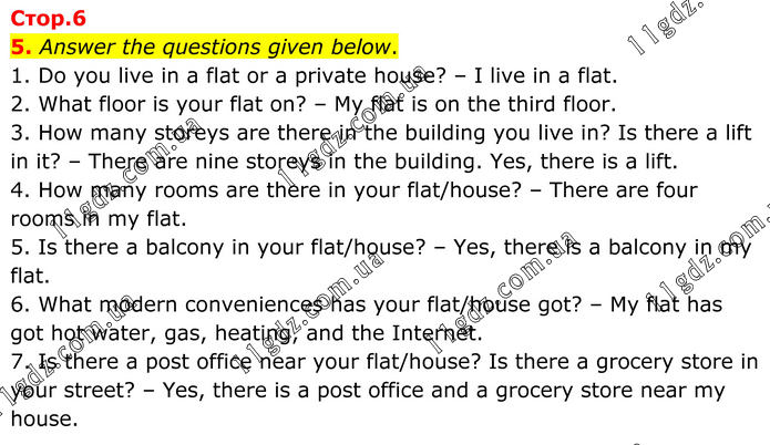 5. Answer the questions given below. 1. Do you live in a flat or a private house? – I live in a flat. 2. What floor is your flat on? – My flat is on the third floor. 3. How many storeys are there in the building you live in? Is there a lift in it? – There are nine storeys in the building. Yes, there is a lift. 4. How many rooms are there in your flat/house? – There are four rooms in my flat. 5. Is there a balcony in your flat/house? – Yes, there is a balcony in my flat. 6. What modern conveniences has your flat/house got? – My flat has got hot water, gas, heating, and the Internet. 7. Is there a post office near your flat/house? Is there a grocery store in your street? – Yes, there is a post office and a grocery store near my house.