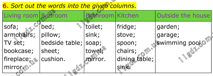 6. Sort out the words into the given columns. Living room Bedroom Bathroom Kitchen Outside the house sofa; armchairs; TV set; bookcase; fireplace; mirror. bed; pillow; bedside table; sheet; cushion. toilet; sink; soap; towel; mirror. fridge; stove; spoon; chairs; dining table; sink. garden; garage; swimming pool.