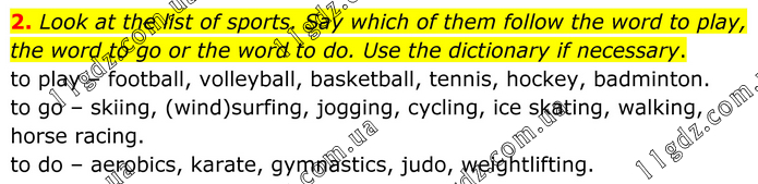 2. Look at the list of sports. Say which of them follow the word to play, the word to go or the word to do. Use the dictionary if necessary. to play – football, volleyball, basketball, tennis, hockey, badminton. to go – skiing, (wind)surfing, jogging, cycling, ice skating, walking, horse racing. to do – aerobics, karate, gymnastics, judo, weightlifting.
