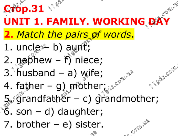 UNIT 1. FAMILY. WORKING DAY 2. Match the pairs of words. 1. uncle – b) aunt; 2. nephew – f) niece; 3. husband – a) wife; 4. father – g) mother; 5. grandfather – c) grandmother; 6. son – d) daughter; 7. brother – e) sister.