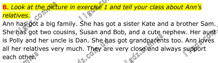 8. Look at the picture in exercise 1 and tell your class about Ann’s relatives. Ann has got a big family. She has got a sister Kate and a brother Sam. She has got two cousins, Susan and Bob, and a cute nephew. Her aunt is Polly and her uncle is Dan. She has got grandparents too. Ann loves all her relatives very much. They are very close and always support each other.