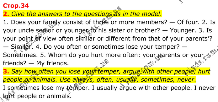 2. Give the answers to the questions as in the model. 1. Does your family consist of three or more members? — Of four. 2. Is your uncle senior or younger to his sister or brother? — Younger. 3. Is your point of view often similar or different from that of your parents’? — Similar. 4. Do you often or sometimes lose your temper? — Sometimes. 5. Whom do you hurt more often: your parents or your friends? — My friends. 3. Say how often you lose your temper, argue with other people, hurt people or animals. Use always, often, usually, sometimes, never. I sometimes lose my temper. I usually argue with other people. I never hurt people or animals.