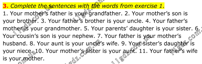 3. Complete the sentences with the words from exercise 1. 1. Your mother’s father is your grandfather. 2. Your mother’s son is your brother. 3. Your father’s brother is your uncle. 4. Your father’s mother is your grandmother. 5. Your parents’ daughter is your sister. 6. Your cousin’s son is your nephew. 7. Your father is your mother’s husband. 8. Your aunt is your uncle’s wife. 9. Your sister’s daughter is your niece. 10. Your mother’s sister is your aunt. 11. Your father’s wife is your mother.