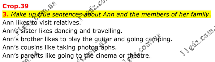 3. Make up true sentences about Ann and the members of her family. Ann likes to visit relatives. Ann’s sister likes dancing and travelling. Ann’s brother likes to play the guitar and going camping. Ann’s cousins like taking photographs. Ann’s parents like going to the cinema or theatre.