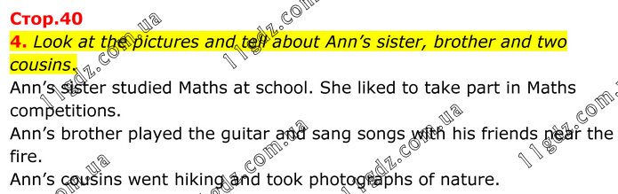 4. Look at the pictures and tell about Ann’s sister, brother and two cousins. Ann’s sister studied Maths at school. She liked to take part in Maths competitions. Ann’s brother played the guitar and sang songs with his friends near the fire. Ann’s cousins went hiking and took photographs of nature.