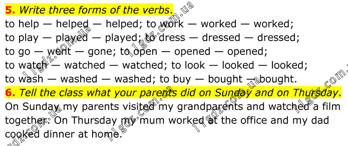 5. Write three forms of the verbs. to help — helped — helped; to work — worked — worked; to play — played — played; to dress — dressed — dressed; to go — went — gone; to open — opened — opened; to watch — watched — watched; to look — looked — looked; to wash — washed — washed; to buy — bought — bought. 6. Tell the class what your parents did on Sunday and on Thursday. On Sunday my parents visited my grandparents and watched a film together. On Thursday my mum worked at the office and my dad cooked dinner at home.