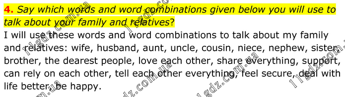 4. Say which words and word combinations given below you will use to talk about your family and relatives? I will use these words and word combinations to talk about my family and relatives: wife, husband, aunt, uncle, cousin, niece, nephew, sister, brother, the dearest people, love each other, share everything, support, can rely on each other, tell each other everything, feel secure, deal with life better, be happy.