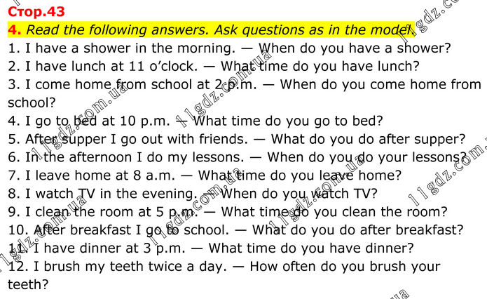4. Read the following answers. Ask questions as in the model. 1. I have a shower in the morning. — When do you have a shower? 2. I have lunch at 11 o’clock. — What time do you have lunch? 3. I come home from school at 2 p.m. — When do you come home from school? 4. I go to bed at 10 p.m. — What time do you go to bed? 5. After supper I go out with friends. — What do you do after supper? 6. In the afternoon I do my lessons. — When do you do your lessons? 7. I leave home at 8 a.m. — What time do you leave home? 8. I watch TV in the evening. — When do you watch TV? 9. I clean the room at 5 p.m. — What time do you clean the room? 10. After breakfast I go to school. — What do you do after breakfast? 11. I have dinner at 3 p.m. — What time do you have dinner? 12. I brush my teeth twice a day. — How often do you brush your teeth?