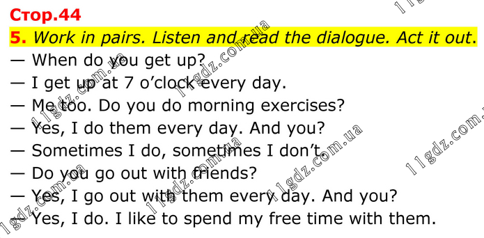 5. Work in pairs. Listen and read the dialogue. Act it out. — When do you get up? — I get up at 7 o’clock every day. — Me too. Do you do morning exercises? — Yes, I do them every day. And you? — Sometimes I do, sometimes I don’t. — Do you go out with friends? — Yes, I go out with them every day. And you? — Yes, I do. I like to spend my free time with them.
