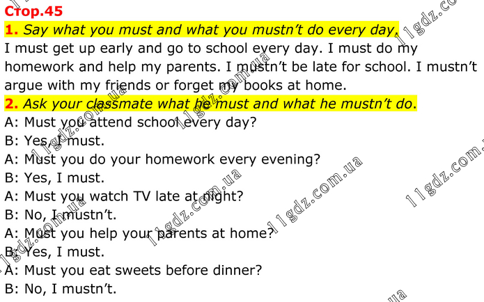 1. Say what you must and what you mustn’t do every day. I must get up early and go to school every day. I must do my homework and help my parents. I mustn’t be late for school. I mustn’t argue with my friends or forget my books at home. 2. Ask your classmate what he must and what he mustn’t do. A: Must you attend school every day? B: Yes, I must. A: Must you do your homework every evening? B: Yes, I must. A: Must you watch TV late at night? B: No, I mustn’t. A: Must you help your parents at home? B: Yes, I must. A: Must you eat sweets before dinner? B: No, I mustn’t.