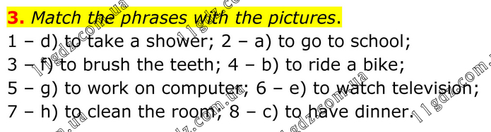 3. Match the phrases with the pictures. 1 – d) to take a shower; 2 – a) to go to school; 3 – f) to brush the teeth; 4 – b) to ride a bike; 5 – g) to work on computer; 6 – e) to watch television; 7 – h) to clean the room; 8 – c) to have dinner.