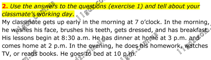 2. Use the answers to the questions (exercise 1) and tell about your classmate’s working day. My classmate gets up early in the morning at 7 o’clock. In the morning, he washes his face, brushes his teeth, gets dressed, and has breakfast. His lessons begin at 8:30 a.m. He has dinner at home at 3 p.m. and comes home at 2 p.m. In the evening, he does his homework, watches TV, or reads books. He goes to bed at 10 p.m.