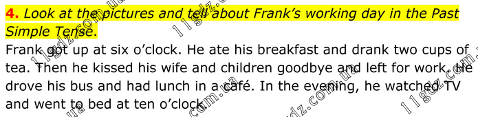 4. Look at the pictures and tell about Frank’s working day in the Past Simple Tense. Frank got up at six o’clock. He ate his breakfast and drank two cups of tea. Then he kissed his wife and children goodbye and left for work. He drove his bus and had lunch in a café. In the evening, he watched TV and went to bed at ten o’clock.