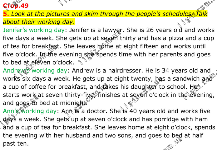 5. Look at the pictures and skim through the people’s schedules. Talk about their working day. Jenifer’s working day: Jenifer is a lawyer. She is 26 years old and works five days a week. She gets up at seven thirty and has a pizza and a cup of tea for breakfast. She leaves home at eight fifteen and works until five o’clock. In the evening she spends time with her parents and goes to bed at eleven o’clock. Andrew’s working day: Andrew is a hairdresser. He is 34 years old and works six days a week. He gets up at eight twenty, has a sandwich and a cup of coffee for breakfast, and takes his daughter to school. He starts work at seven thirty-five, finishes at seven o’clock in the evening, and goes to bed at midnight. Ann’s working day: Ann is a doctor. She is 40 years old and works five days a week. She gets up at seven o’clock and has porridge with ham and a cup of tea for breakfast. She leaves home at eight o’clock, spends the evening with her husband and two sons, and goes to bed at half past ten.