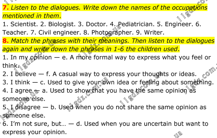 7. Listen to the dialogues. Write down the names of the occupations mentioned in them. 1. Scientist. 2. Biologist. 3. Doctor. 4. Pediatrician. 5. Engineer. 6. Teacher. 7. Civil engineer. 8. Photographer. 9. Writer. 8. Match the phrases with their meanings. Then listen to the dialogues again and write down the phrases in 1-6 the children used. 1. In my opinion — e. A more formal way to express what you feel or think. 2. I believe — f. A casual way to express your thoughts or ideas. 3. I think — c. Used to give your own idea or feeling about something. 4. I agree — a. Used to show that you have the same opinion as someone else. 5. I disagree — b. Used when you do not share the same opinion as someone else. 6. I’m not sure, but… — d. Used when you are uncertain but want to express your opinion.