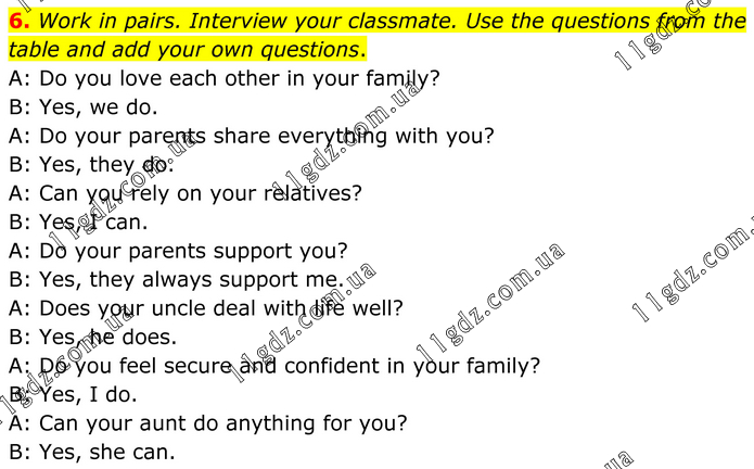 6. Work in pairs. Interview your classmate. Use the questions from the table and add your own questions. A: Do you love each other in your family? B: Yes, we do. A: Do your parents share everything with you? B: Yes, they do. A: Can you rely on your relatives? B: Yes, I can. A: Do your parents support you? B: Yes, they always support me. A: Does your uncle deal with life well? B: Yes, he does. A: Do you feel secure and confident in your family? B: Yes, I do. A: Can your aunt do anything for you? B: Yes, she can.