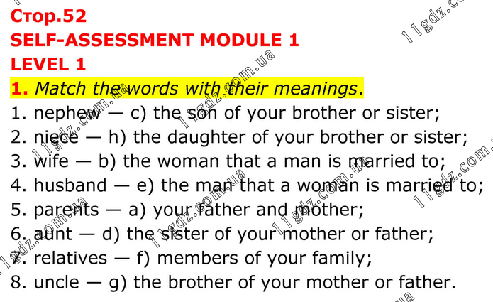 SELF-ASSESSMENT MODULE 1 LEVEL 1 1. Match the words with their meanings. 1. nephew — c) the son of your brother or sister; 2. niece — h) the daughter of your brother or sister; 3. wife — b) the woman that a man is married to; 4. husband — e) the man that a woman is married to; 5. parents — a) your father and mother; 6. aunt — d) the sister of your mother or father; 7. relatives — f) members of your family; 8. uncle — g) the brother of your mother or father.