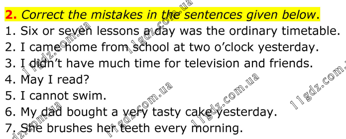 2. Correct the mistakes in the sentences given below. 1. Six or seven lessons a day was the ordinary timetable. 2. I came home from school at two o’clock yesterday. 3. I didn’t have much time for television and friends. 4. May I read? 5. I cannot swim. 6. My dad bought a very tasty cake yesterday. 7. She brushes her teeth every morning.