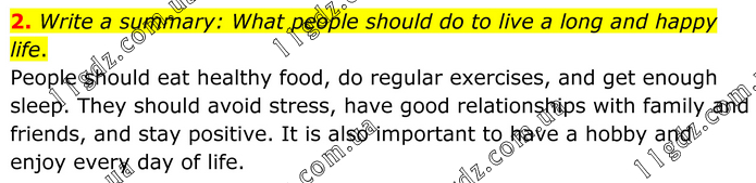 2. Write a summary: What people should do to live a long and happy life. People should eat healthy food, do regular exercises, and get enough sleep. They should avoid stress, have good relationships with family and friends, and stay positive. It is also important to have a hobby and enjoy every day of life.