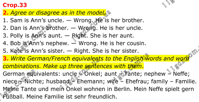 2. Agree or disagree as in the model. 1. Sam is Ann’s uncle. — Wrong. He is her brother. 2. Dan is Ann’s brother. — Wrong. He is her uncle. 3. Polly is Ann’s aunt. — Right. She is her aunt. 4. Bob is Ann’s nephew. — Wrong. He is her cousin. 5. Kate is Ann’s sister. — Right. She is her sister. 3. Write German/French equivalents to the English words and word combinations. Make up three sentences with them. German equivalents: uncle – Onkel; aunt – Tante; nephew – Neffe; niece – Nichte; husband – Ehemann; wife – Ehefrau; family – Familie. Meine Tante und mein Onkel wohnen in Berlin. Mein Neffe spielt gern Fußball. Meine Familie ist sehr freundlich.