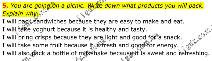 5. You are going on a picnic. Write down what products you will pack. Explain why. I will pack sandwiches because they are easy to make and eat. I will take yoghurt because it is healthy and tasty. I will bring crisps because they are light and good for a snack. I will take some fruit because it is fresh and good for energy. I will also pack a bottle of milkshake because it is sweet and refreshing.