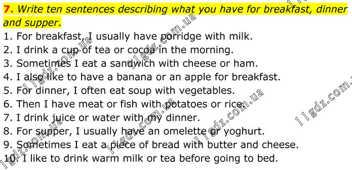 7. Write ten sentences describing what you have for breakfast, dinner and supper. 1. For breakfast, I usually have porridge with milk. 2. I drink a cup of tea or cocoa in the morning. 3. Sometimes I eat a sandwich with cheese or ham. 4. I also like to have a banana or an apple for breakfast. 5. For dinner, I often eat soup with vegetables. 6. Then I have meat or fish with potatoes or rice. 7. I drink juice or water with my dinner. 8. For supper, I usually have an omelette or yoghurt. 9. Sometimes I eat a piece of bread with butter and cheese. 10. I like to drink warm milk or tea before going to bed.