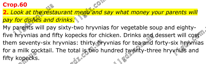 2. Look at the restaurant menu and say what money your parents will pay for dishes and drinks. My parents will pay sixty-two hryvnias for vegetable soup and eighty-five hryvnias and fifty kopecks for chicken. Drinks and dessert will cost them seventy-six hryvnias: thirty hryvnias for tea and forty-six hryvnias for a milk cocktail. The total is two hundred twenty-three hryvnias and fifty kopecks.