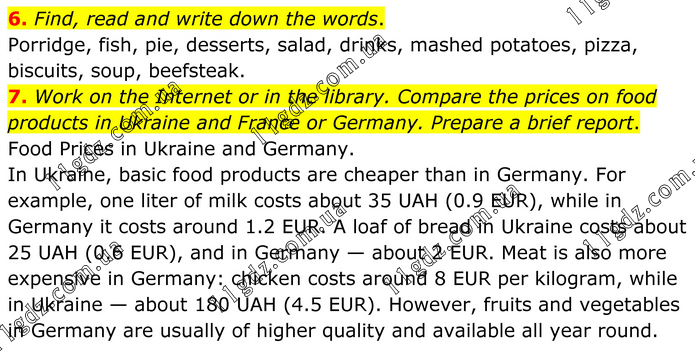 6. Find, read and write down the words. Porridge, fish, pie, desserts, salad, drinks, mashed potatoes, pizza, biscuits, soup, beefsteak. 7. Work on the Internet or in the library. Compare the prices on food products in Ukraine and France or Germany. Prepare a brief report. Food Prices in Ukraine and Germany. In Ukraine, basic food products are cheaper than in Germany. For example, one liter of milk costs about 35 UAH (0.9 EUR), while in Germany it costs around 1.2 EUR. A loaf of bread in Ukraine costs about 25 UAH (0.6 EUR), and in Germany — about 2 EUR. Meat is also more expensive in Germany: chicken costs around 8 EUR per kilogram, while in Ukraine — about 180 UAH (4.5 EUR). However, fruits and vegetables in Germany are usually of higher quality and available all year round.