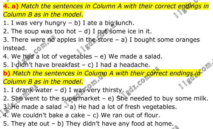 4. a) Match the sentences in Column A with their correct endings in Column B as in the model. 1. I was very hungry – b) I ate a big lunch. 2. The soup was too hot – d) I put some ice in it. 3. There were no apples in the store – a) I bought some oranges instead. 4. We had a lot of vegetables – e) We made a salad. 5. I didn’t have breakfast – c) I had a headache. b) Match the sentences in Column A with their correct endings in Column B as in the model. 1. I drank water – d) I was very thirsty. 2. She went to the supermarket – e) She needed to buy some milk. 3. He made a salad – a) He had a lot of fresh vegetables. 4. We couldn’t bake a cake – c) We ran out of flour. 5. They ate out – b) They didn’t have any food at home.
