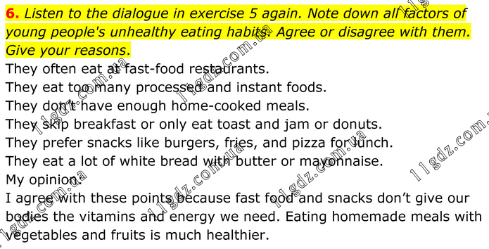 6. Listen to the dialogue in exercise 5 again. Note down all factors of young people's unhealthy eating habits. Agree or disagree with them. Give your reasons. They often eat at fast-food restaurants. They eat too many processed and instant foods. They don’t have enough home-cooked meals. They skip breakfast or only eat toast and jam or donuts. They prefer snacks like burgers, fries, and pizza for lunch. They eat a lot of white bread with butter or mayonnaise. My opinion: I agree with these points because fast food and snacks don’t give our bodies the vitamins and energy we need. Eating homemade meals with vegetables and fruits is much healthier.