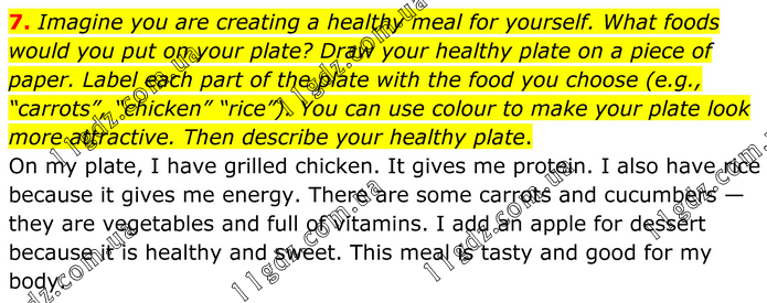 7. Imagine you are creating a healthy meal for yourself. What foods would you put on your plate? Draw your healthy plate on a piece of paper. Label each part of the plate with the food you choose (e.g., “carrots”, “chicken” “rice”). You can use colour to make your plate look more attractive. Then describe your healthy plate. On my plate, I have grilled chicken. It gives me protein. I also have rice because it gives me energy. There are some carrots and cucumbers — they are vegetables and full of vitamins. I add an apple for dessert because it is healthy and sweet. This meal is tasty and good for my body.