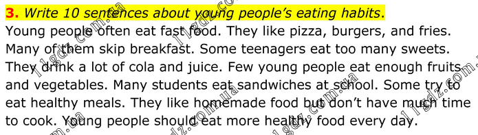 3. Write 10 sentences about young people’s eating habits. Young people often eat fast food. They like pizza, burgers, and fries. Many of them skip breakfast. Some teenagers eat too many sweets. They drink a lot of cola and juice. Few young people eat enough fruits and vegetables. Many students eat sandwiches at school. Some try to eat healthy meals. They like homemade food but don’t have much time to cook. Young people should eat more healthy food every day.