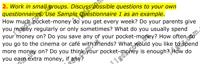 2. Work in small groups. Discuss possible questions to your own questionnaires. Use Sample Questionnaire 1 as an example. How much pocket-money do you get every week? Do your parents give you money regularly or only sometimes? What do you usually spend your money on? Do you save any of your pocket-money? How often do you go to the cinema or café with friends? What would you like to spend more money on? Do you think your pocket-money is enough? How do you earn extra money, if any?