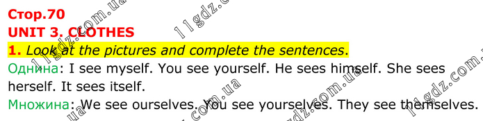 UNIT 3. CLOTHES 1. Look at the pictures and complete the sentences. Однина: I see myself. You see yourself. He sees himself. She sees herself. It sees itself. Множина: We see ourselves. You see yourselves. They see themselves.