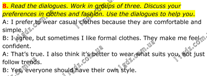 8. Read the dialogues. Work in groups of three. Discuss your preferences in clothes and fashion. Use the dialogues to help you. A: I prefer to wear casual clothes because they are comfortable and simple. B: I agree, but sometimes I like formal clothes. They make me feel confident. A: That’s true. I also think it’s better to wear what suits you, not just follow trends. B: Yes, everyone should have their own style.