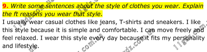 9. Write some sentences about the style of clothes you wear. Explain the ft reasons you wear that style. I usually wear casual clothes like jeans, T-shirts and sneakers. I like this style because it is simple and comfortable. I can move freely and feel relaxed. I wear this style every day because it fits my personality and lifestyle.