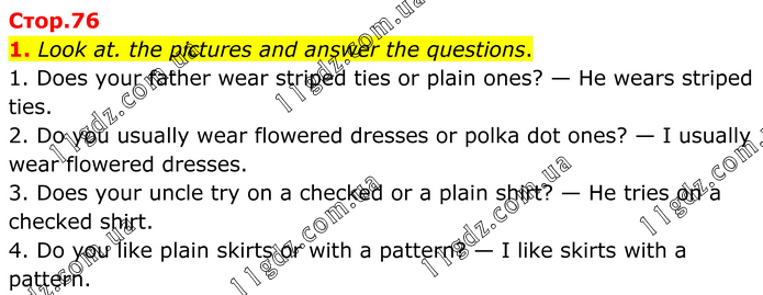1. Look at. the pictures and answer the questions. 1. Does your father wear striped ties or plain ones? — He wears striped ties. 2. Do you usually wear flowered dresses or polka dot ones? — I usually wear flowered dresses. 3. Does your uncle try on a checked or a plain shirt? — He tries on a checked shirt. 4. Do you like plain skirts or with a pattern? — I like skirts with a pattern.