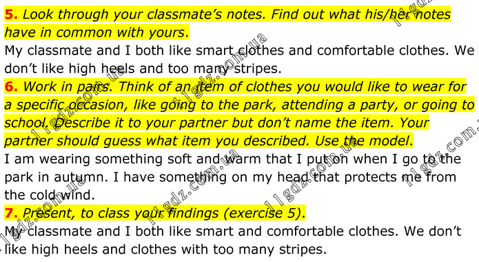 5. Look through your classmate’s notes. Find out what his/her notes have in common with yours. My classmate and I both like smart clothes and comfortable clothes. We don’t like high heels and too many stripes. 6. Work in pairs. Think of an item of clothes you would like to wear for a specific occasion, like going to the park, attending a party, or going to school. Describe it to your partner but don’t name the item. Your partner should guess what item you described. Use the model. I am wearing something soft and warm that I put on when I go to the park in autumn. I have something on my head that protects me from the cold wind. 7. Present, to class your findings (exercise 5). My classmate and I both like smart and comfortable clothes. We don’t like high heels and clothes with too many stripes.