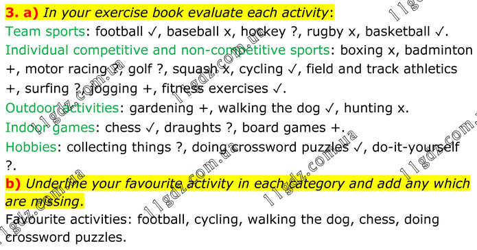 3. a) In your exercise book evaluate each activity: Team sports: football ✓, baseball x, hockey ?, rugby x, basketball ✓. Individual competitive and non-competitive sports: boxing x, badminton +, motor racing ?, golf ?, squash x, cycling ✓, field and track athletics +, surfing ?, jogging +, fitness exercises ✓. Outdoor activities: gardening +, walking the dog ✓, hunting x. Indoor games: chess ✓, draughts ?, board games +. Hobbies: collecting things ?, doing crossword puzzles ✓, do-it-yourself ?. b) Underline your favourite activity in each category and add any which are missing. Favourite activities: football, cycling, walking the dog, chess, doing crossword puzzles.