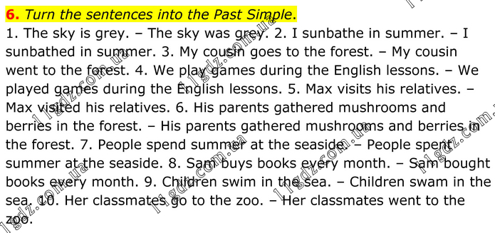 6. Turn the sentences into the Past Simple. 1. The sky is grey. – The sky was grey. 2. I sunbathe in summer. – I sunbathed in summer. 3. My cousin goes to the forest. – My cousin went to the forest. 4. We play games during the English lessons. – We played games during the English lessons. 5. Max visits his relatives. – Max visited his relatives. 6. His parents gathered mushrooms and berries in the forest. – His parents gathered mushrooms and berries in the forest. 7. People spend summer at the seaside. – People spent summer at the seaside. 8. Sam buys books every month. – Sam bought books every month. 9. Children swim in the sea. – Children swam in the sea. 10. Her classmates go to the zoo. – Her classmates went to the zoo.