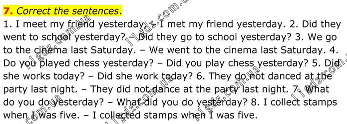 7. Correct the sentences. 1. I meet my friend yesterday. – I met my friend yesterday. 2. Did they went to school yesterday? – Did they go to school yesterday? 3. We go to the cinema last Saturday. – We went to the cinema last Saturday. 4. Do you played chess yesterday? – Did you play chess yesterday? 5. Did she works today? – Did she work today? 6. They do not danced at the party last night. – They did not dance at the party last night. 7. What do you do yesterday? – What did you do yesterday? 8. I collect stamps when I was five. – I collected stamps when I was five.