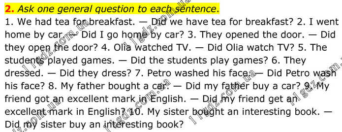 2. Ask one general question to each sentence. 1. We had tea for breakfast. — Did we have tea for breakfast? 2. I went home by car. — Did I go home by car? 3. They opened the door. — Did they open the door? 4. Olia watched TV. — Did Olia watch TV? 5. The students played games. — Did the students play games? 6. They dressed. — Did they dress? 7. Petro washed his face. — Did Petro wash his face? 8. My father bought a car. — Did my father buy a car? 9. My friend got an excellent mark in English. — Did my friend get an excellent mark in English? 10. My sister bought an interesting book. — Did my sister buy an interesting book?
