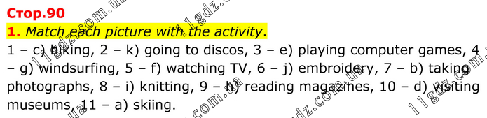 1. Match each picture with the activity. 1 – c) hiking, 2 – k) going to discos, 3 – e) playing computer games, 4 – g) windsurfing, 5 – f) watching TV, 6 – j) embroidery, 7 – b) taking photographs, 8 – i) knitting, 9 – h) reading magazines, 10 – d) visiting museums, 11 – a) skiing.