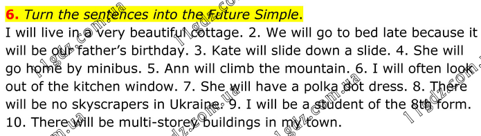 6. Turn the sentences into the Future Simple. I will live in a very beautiful cottage. 2. We will go to bed late because it will be our father’s birthday. 3. Kate will slide down a slide. 4. She will go home by minibus. 5. Ann will climb the mountain. 6. I will often look out of the kitchen window. 7. She will have a polka dot dress. 8. There will be no skyscrapers in Ukraine. 9. I will be a student of the 8th form. 10. There will be multi-storey buildings in my town.