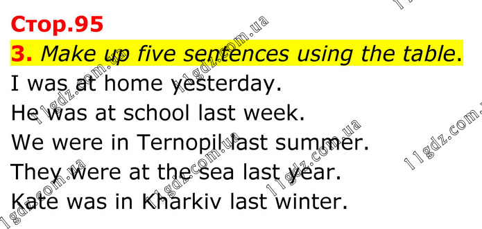 3. Make up five sentences using the table. I was at home yesterday. He was at school last week. We were in Ternopil last summer. They were at the sea last year. Kate was in Kharkiv last winter.