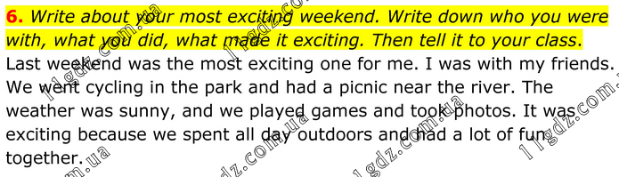 6. Write about your most exciting weekend. Write down who you were with, what you did, what made it exciting. Then tell it to your class. Last weekend was the most exciting one for me. I was with my friends. We went cycling in the park and had a picnic near the river. The weather was sunny, and we played games and took photos. It was exciting because we spent all day outdoors and had a lot of fun together.