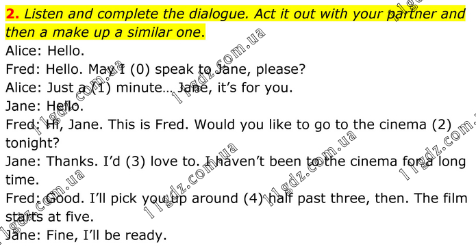 2. Listen and complete the dialogue. Act it out with your partner and then a make up a similar one. Alice: Hello. Fred: Hello. May I (0) speak to Jane, please? Alice: Just a (1) minute… Jane, it’s for you. Jane: Hello. Fred: Hi, Jane. This is Fred. Would you like to go to the cinema (2) tonight? Jane: Thanks. I’d (3) love to. I haven’t been to the cinema for a long time. Fred: Good. I’ll pick you up around (4) half past three, then. The film starts at five. Jane: Fine, I’ll be ready.