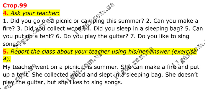 4. Ask your teacher: 1. Did you go on a picnic or camping this summer? 2. Can you make a fire? 3. Did you collect wood? 4. Did you sleep in a sleeping bag? 5. Can you put up a tent? 6. Do you play the guitar? 7. Do you like to sing songs? 5. Report the class about your teacher using his/her answer (exercise 4). My teacher went on a picnic this summer. She can make a fire and put up a tent. She collected wood and slept in a sleeping bag. She doesn’t play the guitar, but she likes to sing songs.