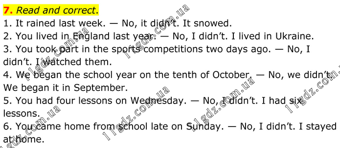 7. Read and correct. 1. It rained last week. — No, it didn’t. It snowed. 2. You lived in England last year. — No, I didn’t. I lived in Ukraine. 3. You took part in the sports competitions two days ago. — No, I didn’t. I watched them. 4. We began the school year on the tenth of October. — No, we didn’t. We began it in September. 5. You had four lessons on Wednesday. — No, I didn’t. I had six lessons. 6. You came home from school late on Sunday. — No, I didn’t. I stayed at home.